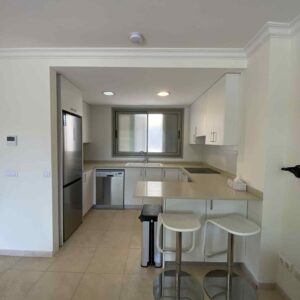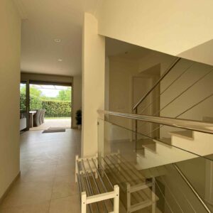 Parter: Przestronny, jasny hol prowadzący do salonu połączonego z jadalnią, a dalej do w pełni wyposażonej kuchni z wyjściem na dużą tarasowanie z prywatnym basenem; na tej samej kondygnacji znajdują się dwa pokoje i toaleta dla gości.