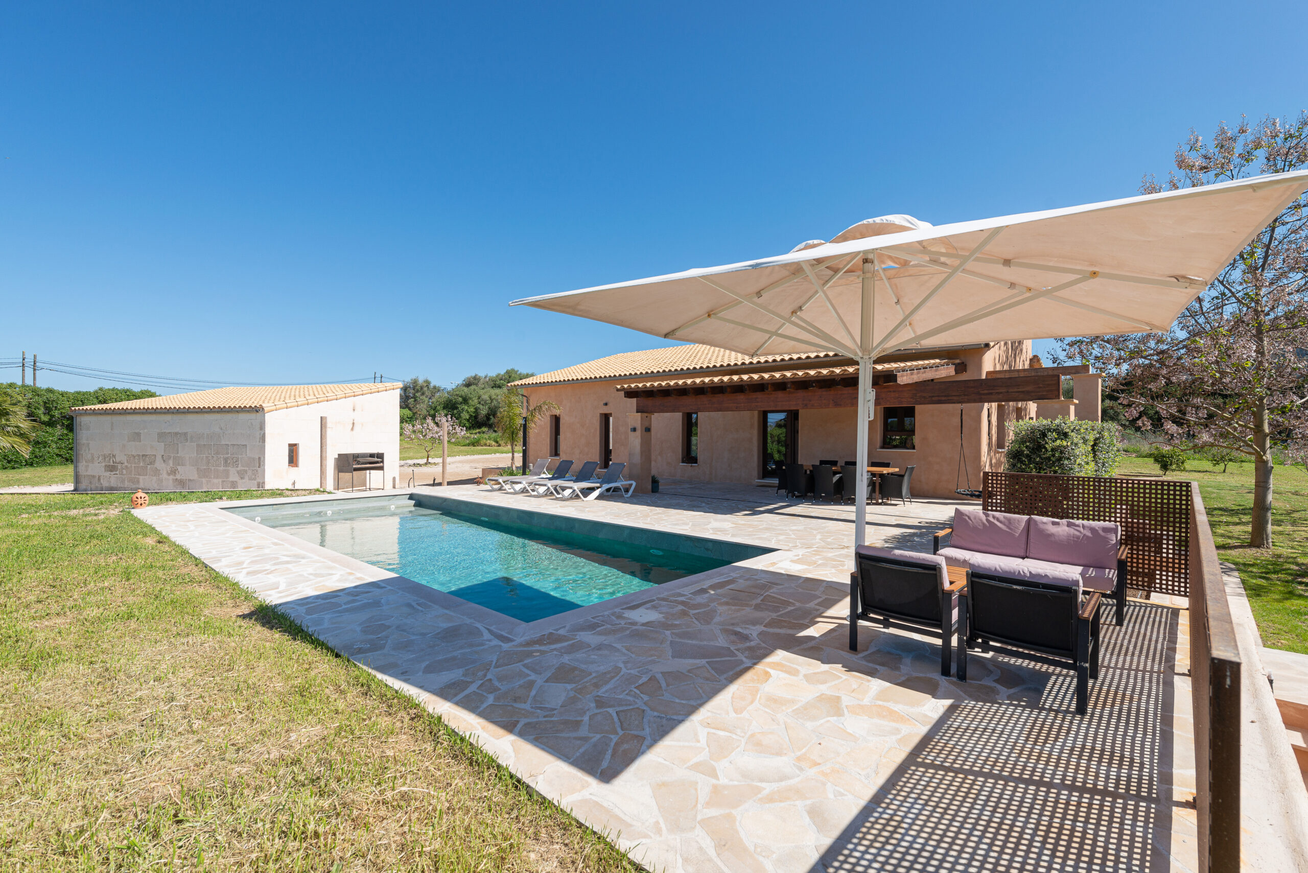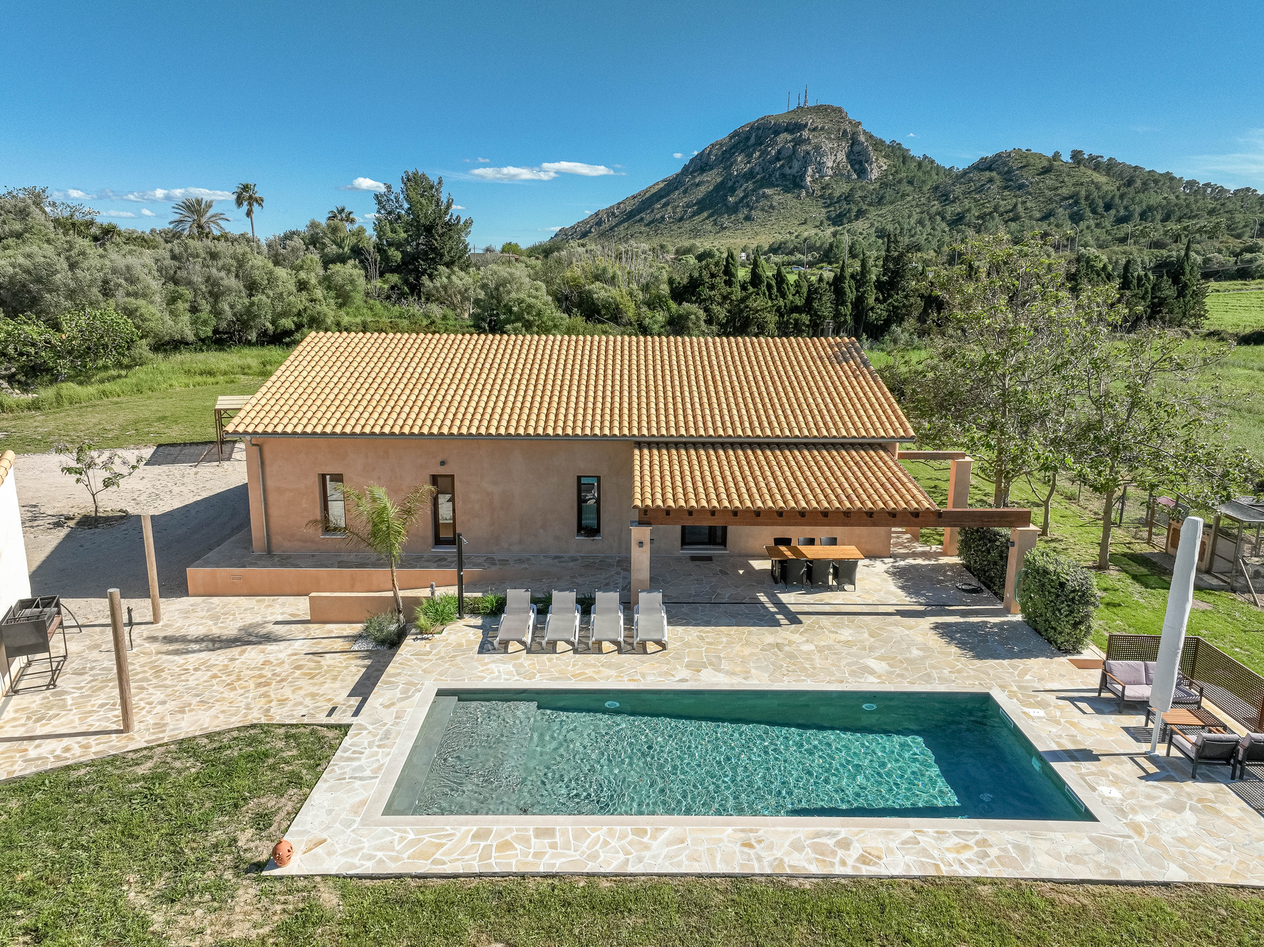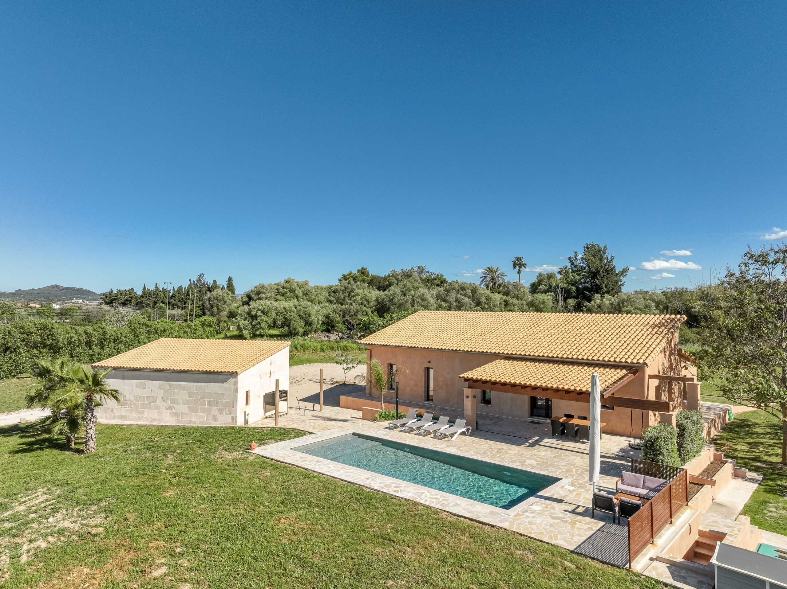 Na terenie posesji znajduje się również basen o wymiarach 10×4 m z systemem przeciwprądowym, 30 m² zadaszonego tarasu od strony północnej, pergola od strony południowej, strefa grillowa i ponad 250 m² tarasów. Piękne ogrody, drzewa owocowe i gaj oliwny z automatycznym systemem nawadniania.